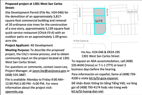 Notice of Community Meeting 3/27/25 Re: Chick-fil-A project at 1301 W San Carlos Street (File No. H24-046)